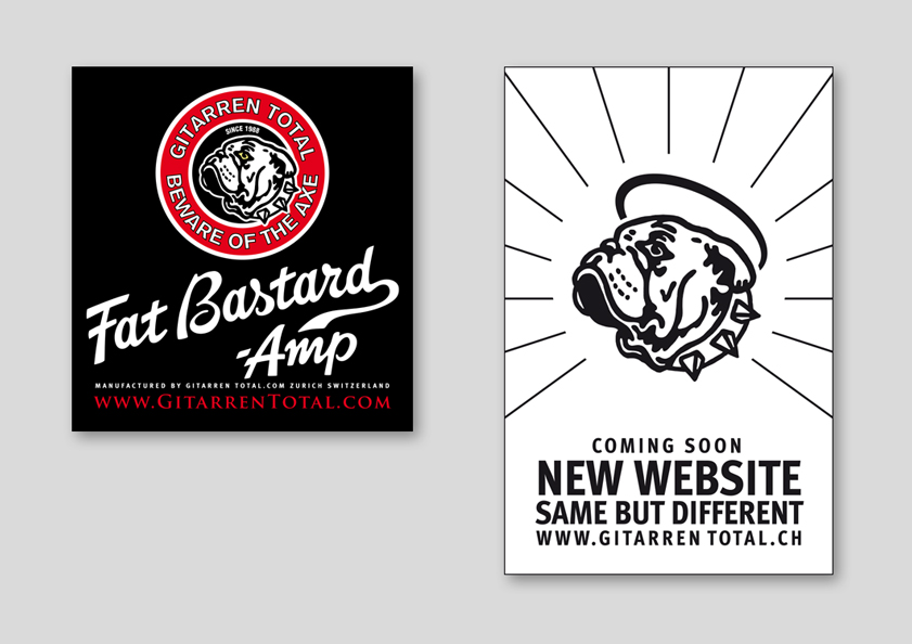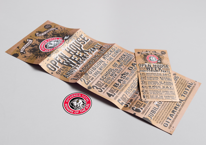 Betreuung in allen Kommunikationsfragen von der Schaufenstergestaltung, über Sticker, Gitarren-Oel-Verpackung und Tragtaschen bis hin zum Image-Inserat. Gestaltung von Bannern, Fahrzeugbeschriftungen, Flyern, Inseraten, Verpackungen und T-Shirts.