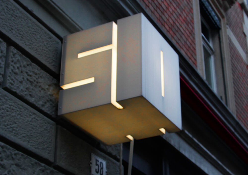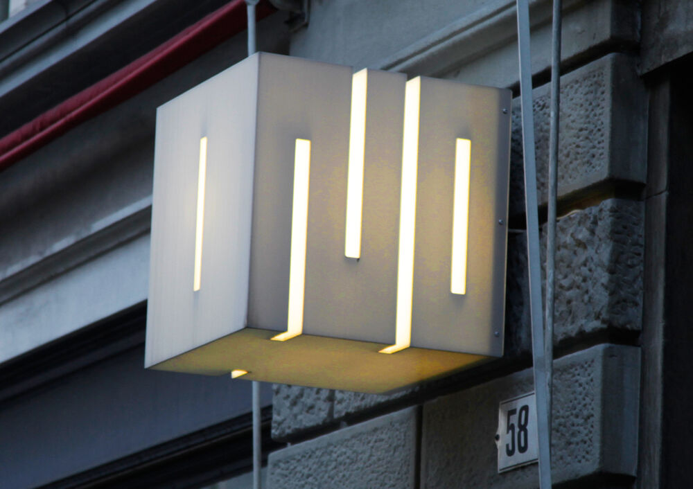 Erarbeitung eines dreidimensionalen Logotypes, Erscheinungsbild, Aussenbeschriftung (Leuchtreklame als Würfel).
