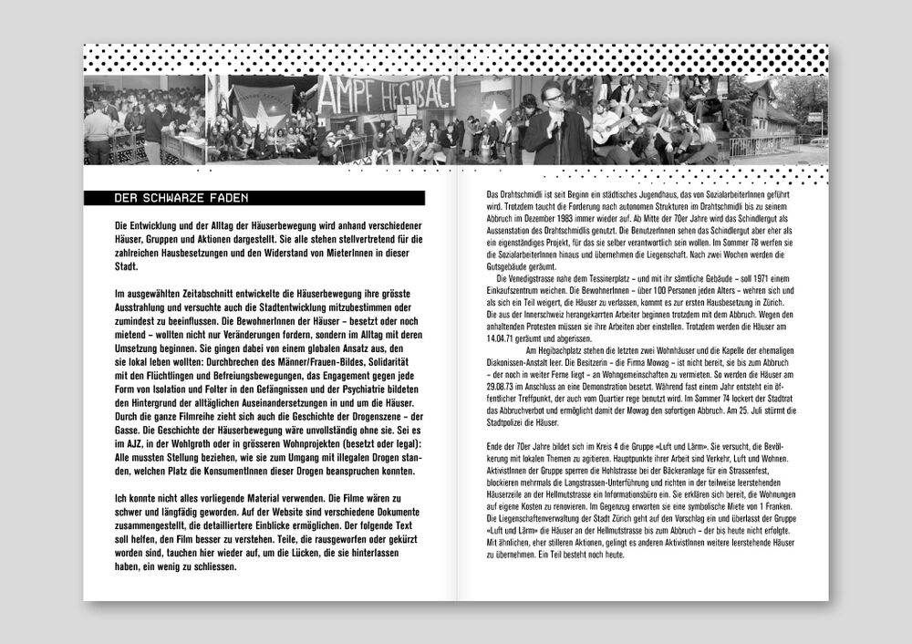 Mischa Brutschin stellte über mehrere Jahre Texte, Filmmaterial, Plakate und Tondokumente aus der Zeit der Zürcher Häuserbewegung von 1979 bis 1994 zusammen. Das Resultat ist eine filmische Dokumentation in acht Teilen.