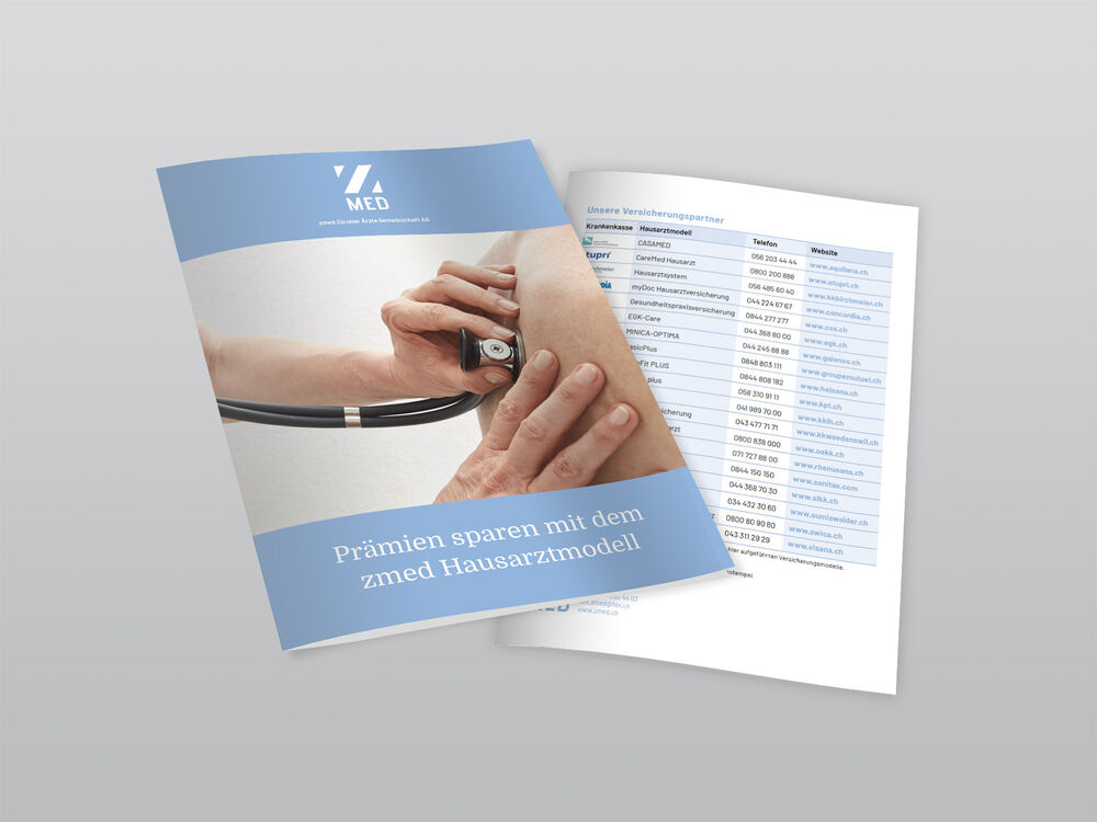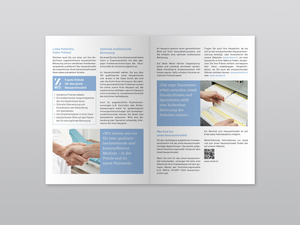 Gestaltung von Foldern, Jahresberichten etc. im neuen Look der zmed Zürcher Ärzte Gemeinschaft.