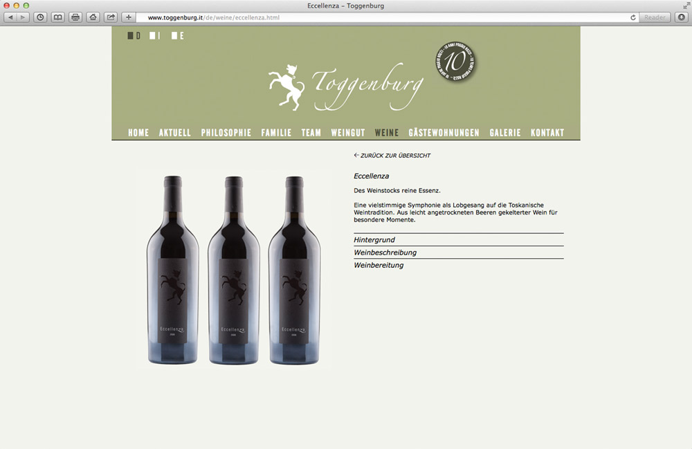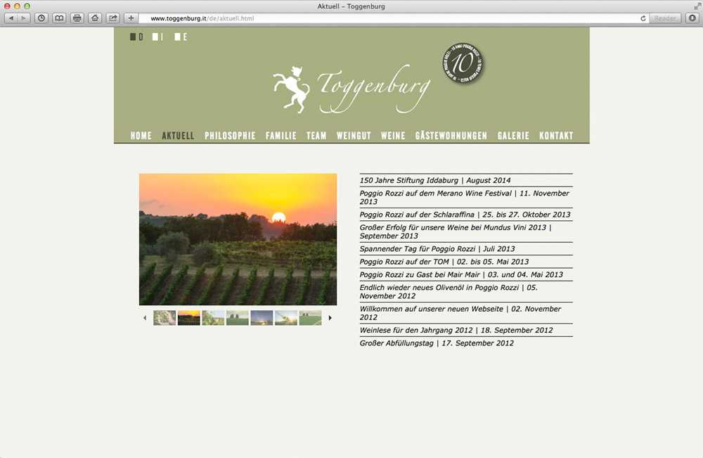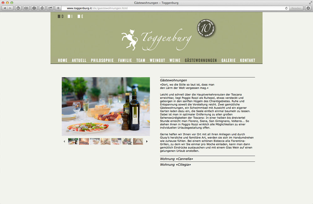 Dreisprachige Webseite in Typo3, die die Philosophie und Arbeitsweise der Conti Toggenburg spiegelt. Weinbeschreibungen, Vermarktung von Ferienwohnungen, Full-Screen-Galerien etc.
