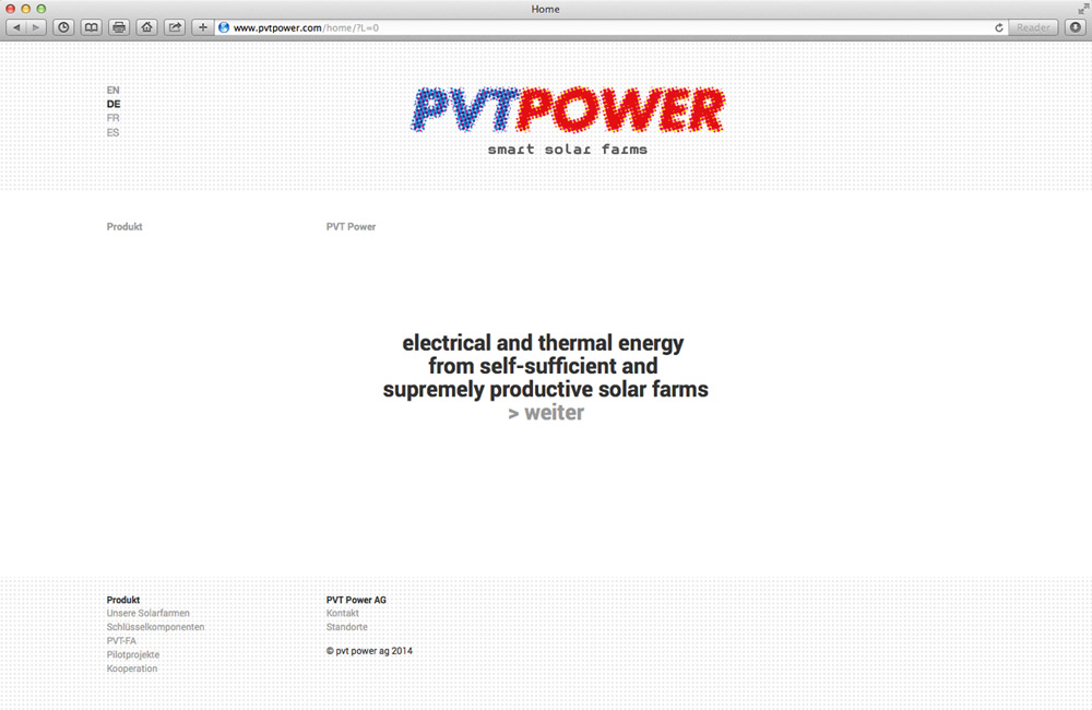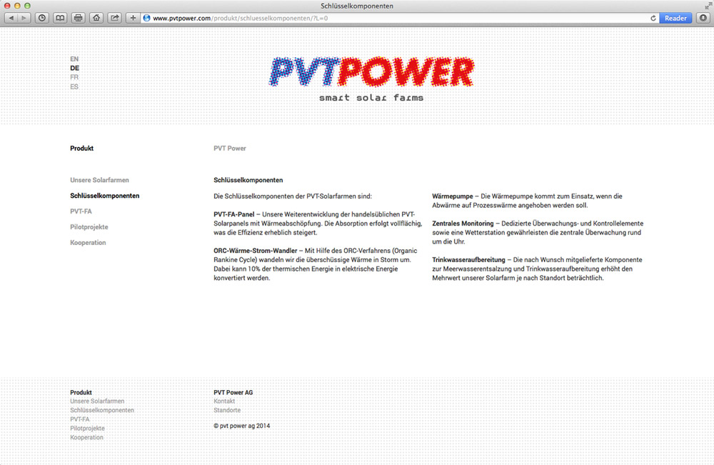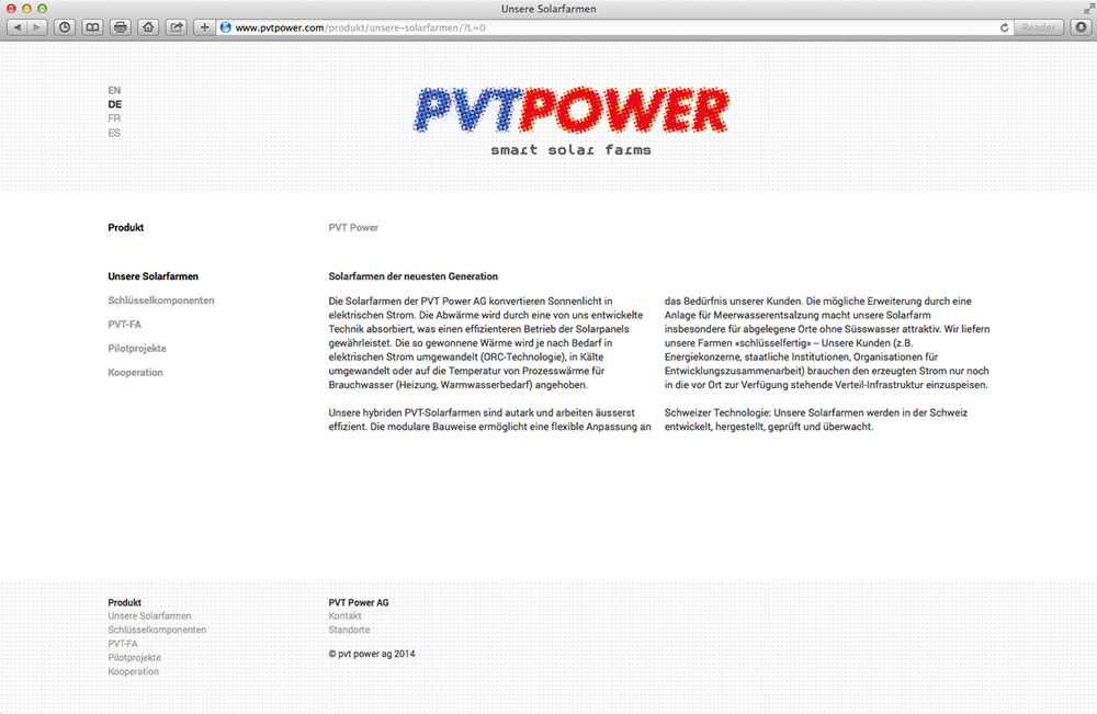 Die Solarfarmen der PVT Power AG konvertieren Sonnenlicht in elektrischen Strom. Die Abwärme wird durch eine von PVT Power entwickelte Technik absorbiert, was einen effizienteren Betrieb der Solarpanels gewährleistet.